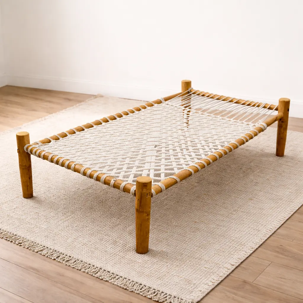 At Kattil.com, our rope beds are made from high-quality wood or bamboo frames, combined with strong cotton or synthetic ropes that are tightly woven for durability and comfort.